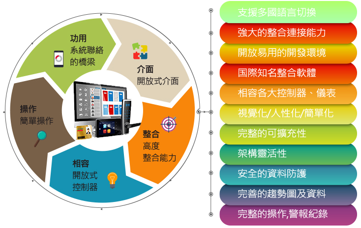 須提供業界常用之開放式資料庫或通訊協定編輯, 如OPC資料庫、Modbus、AC訊協定 , 亦可相容於其他系統,並供其整合(須提供資料)